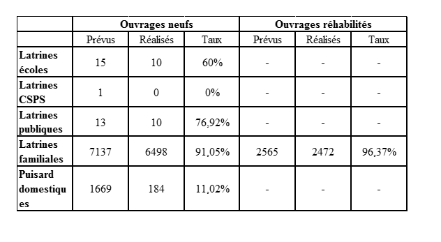 • 10 blocs de latrines publiques ont été réalisés sur une programmation de 13. Soit un taux d‘exécution de 76,92% ;