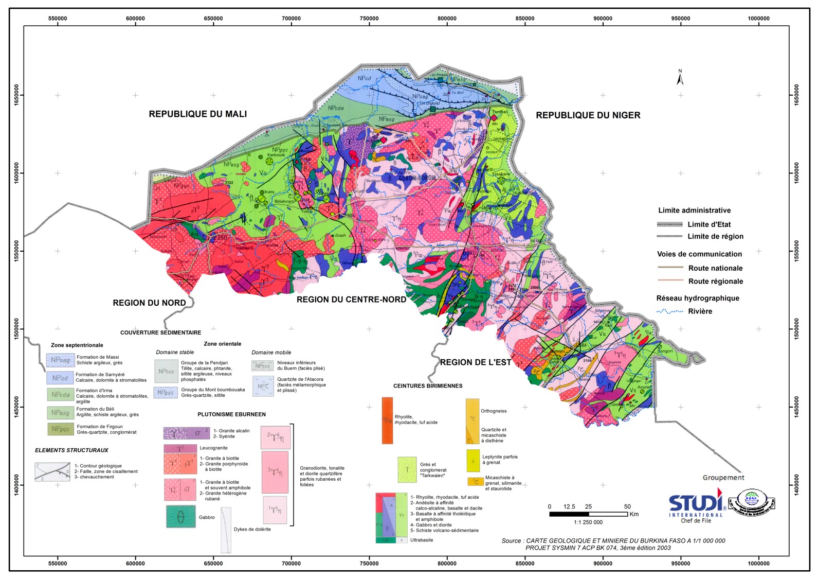 Carte géologique et minière du Burkina Faso à l’échelle 1/1000 000, avec note explicative – Ministère des Mines, des Carrières et de l’Energie (Burkina Faso), BRGM – Edition 2003 ;